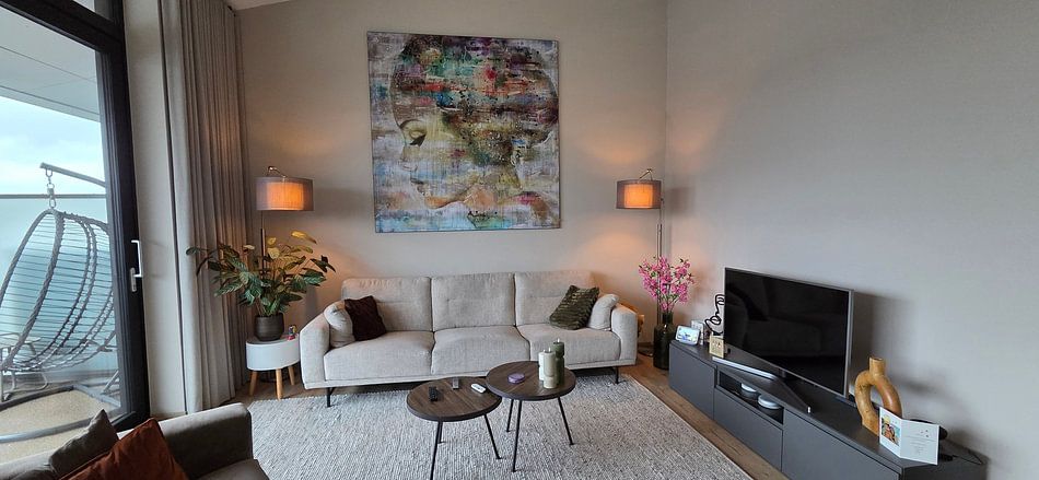 De rustgevende en nostalgische uitstraling van Colourful Camel Werk aan de Muur 2019 leent zich goed voor een gallery wall met andere kunstwerken in vergelijkbare warme kleuren. Combineer staande, liggende en vierkante formaten voor een gevarieerd geheel. Voeg decoratie toe die de mysterieuze sfeer versterkt, zoals houten accessoires, aarden vazen of zachte textiel in taupe en beige tinten. Zo creëer je een warme, samenhangende uitstraling die rust en karakter aan je woonkamer geeft.