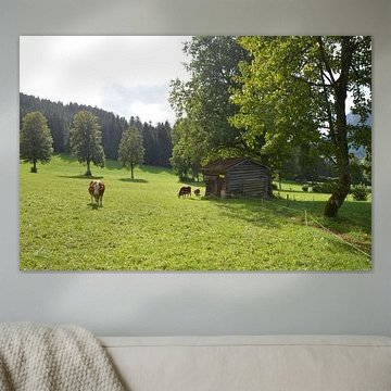 Koeien brengen rust in huis. Hun kalme uitstraling en warme tinten passen bij vrijwel elke woonstijl, van landelijk tot modern. Je vindt hier zowel speelse schilderkunst in felle kleuren als serene fotografie in aardse tonen, zoals Twee Koeien In Mistig Landschap met mistige bruintinten of Koe met tulpen met vrolijke bloemen.