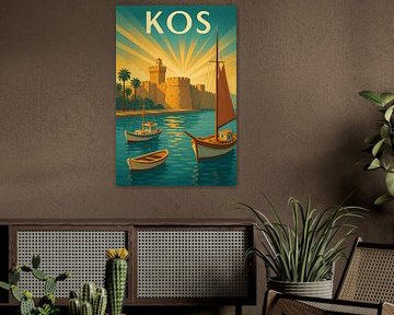 Kos Art Deco Poster - Havenboten en kasteelmuren van Travel Shop