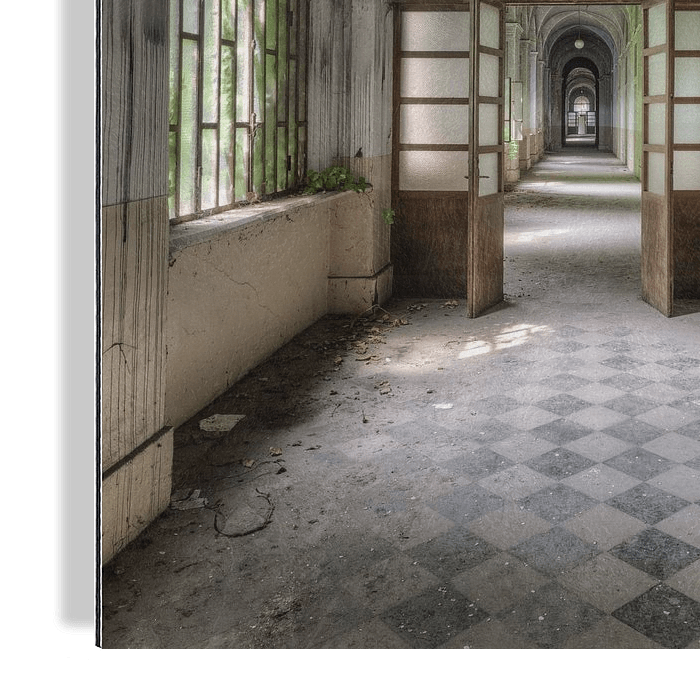Deze zeer indrukwekkende gang maakt onderdeel uit van een verlaten ziekenhuis. In de tijd dat niet alleen aan functionaliteit werd gedacht.
