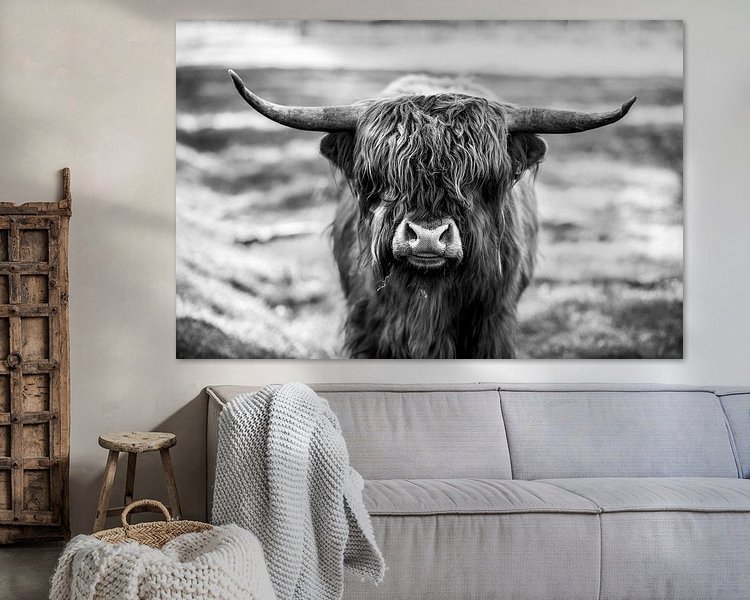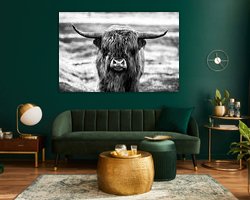 Portret Schotse Hooglander zwart wit in de natuur, Schottish Higlander black and white.